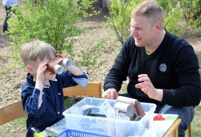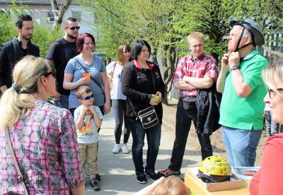 FamilienfestHans Lämmerhirt ist seit 46 Jahren Polizist und mit dem Streifenwagen in Gerresheim-Süd unterwegs. Er erklärte beim Fest, wie Fahrradhelme richtig getragen werden. "Man kann nicht genug über Sicherheit reden", sagt er. Um die Verkehrsregeln zu vertiefen, müssten Eltern immer wieder mit den Kindern üben. Denn diese konzentrierten sich immer nur auf das, was gerade in ihrem Blickfeld sei. Das Umfeld links und rechts nehmen sie kaum wahr, sehen anders, hören anders und können bei Gefahr nicht aprupt stehen bleiben. Deshalb bastelten Eltern und Kinder gemeinsam die "Eltern-Brille" und schritten einen Parcours ab. So konnten sie erfahren, was der "Tunnelblick" bedeutet, den Kinder bis etwa zum 8. Lebensjahr haben. Einen ganzen Nachmittag lang durften alle gemeinsam im großen Garten an verschiedenen Stationen spielen. Dazu gab es Kaffee und Kuchen bei herrlichem Sonnenschein. | Öffnungszeiten Montag - Freitag: Kontakt Kindertagesstätte St.Katharina Tel: 02 11 - 27 61 00 eMail: Kita.St-Katharina@st-margareta.de LeitungTina Wojcik