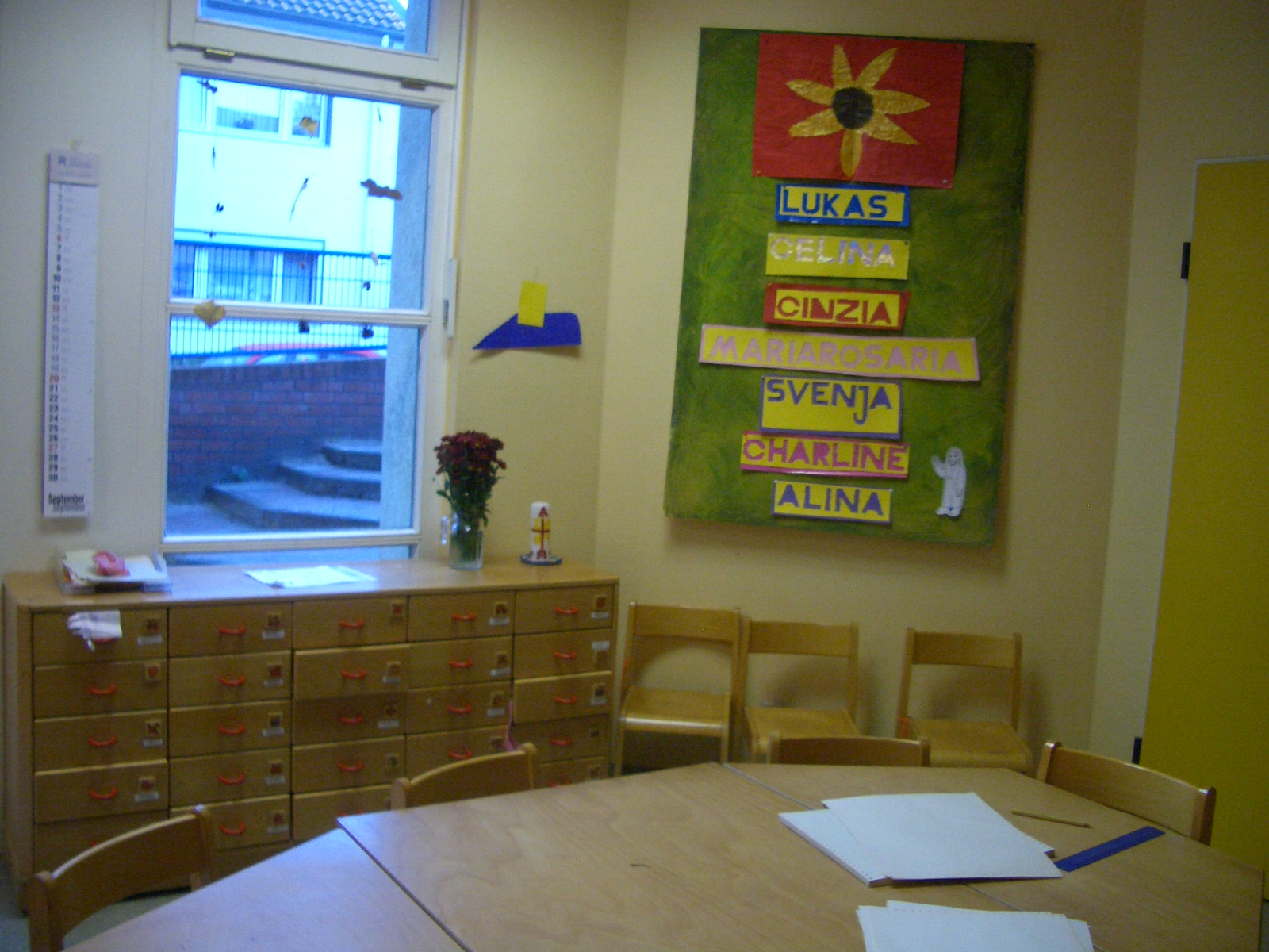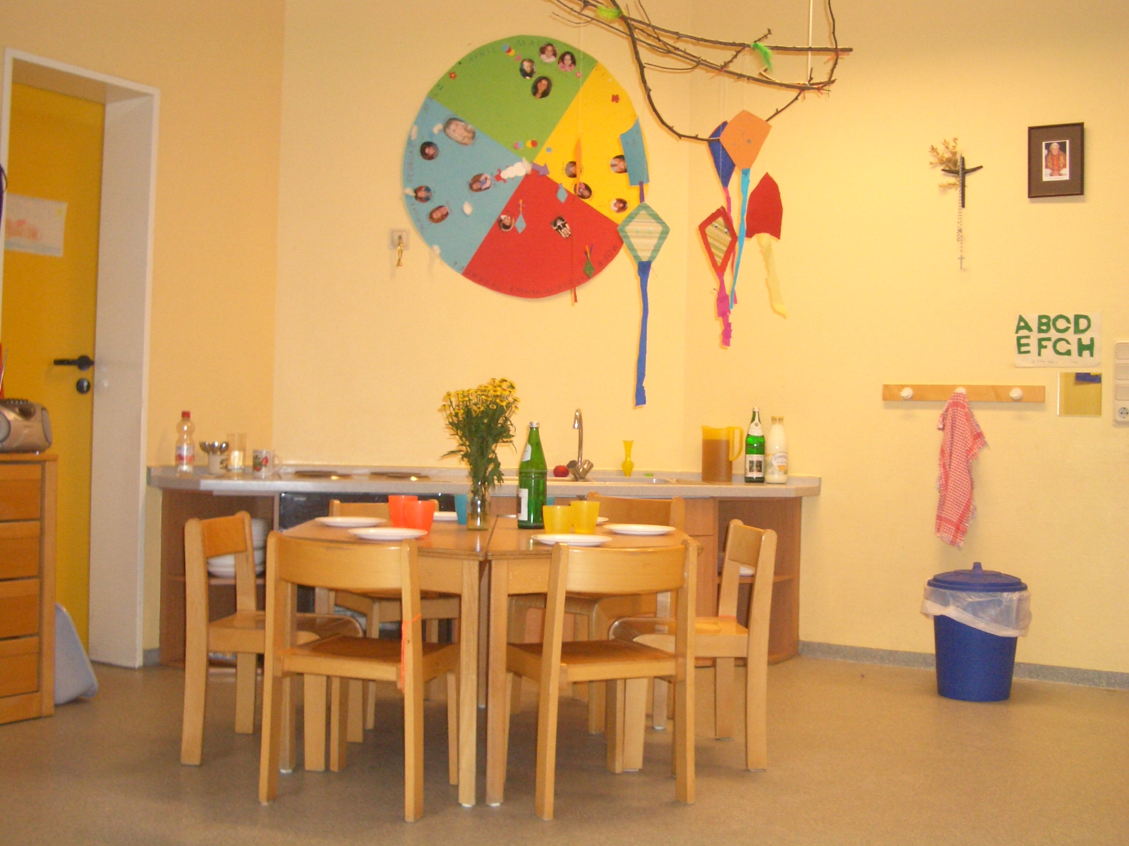 In unserer Gruppe wird viel Wert darauf gelegt, dass sich die Kinder frei entfalten können. Ob Frühling, Sommer, Herbst oder Winter, jede Jahreszeit wird in allen kreativen und motorischen Bereichen erarbeitet, um die Fähigkeiten und Interessen des Kindes ganzheitlich zu unterstützen. Als Erzieherinnen sind Frau Giesen, Frau Schröter und Frau Hodes in dieser Gruppe tätig. Hier ein paar Einblicke in unsere Gruppe:Übersicht Originalgröße der Frühstückstisch Übersicht Originalgröße der Konstruktionsbereich Übersicht Originalgröße Religionspädagogik Übersicht Originalgröße Bücherecke im Nebenraum